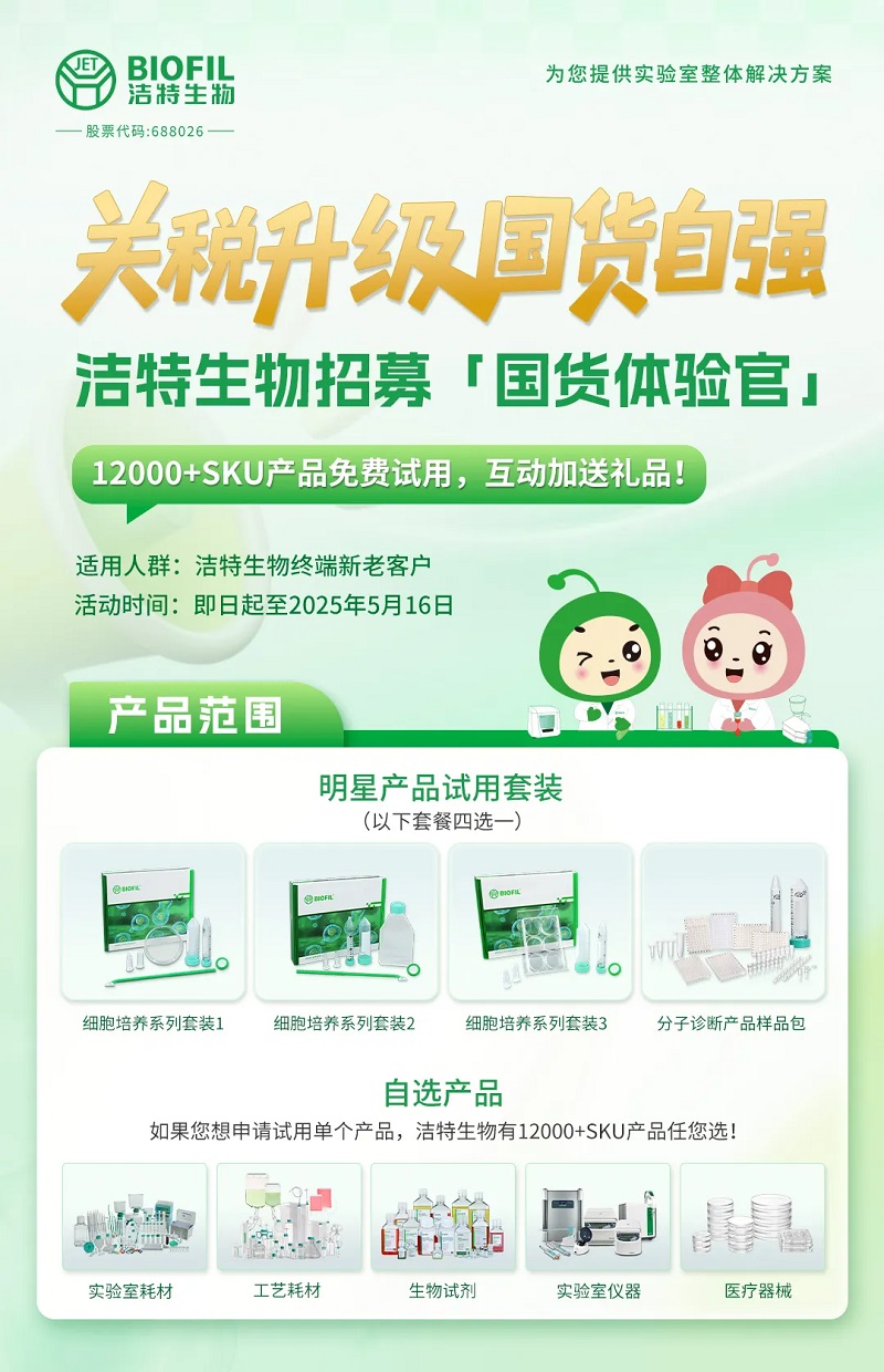 如果您想申請?jiān)囉脝蝹€(gè)產(chǎn)品,潔特生物有12000+SKU產(chǎn)品任您選!涵蓋生物實(shí)驗(yàn)室耗材、生物工藝耗材、生物試劑、實(shí)驗(yàn)室儀器、醫(yī)療器械。