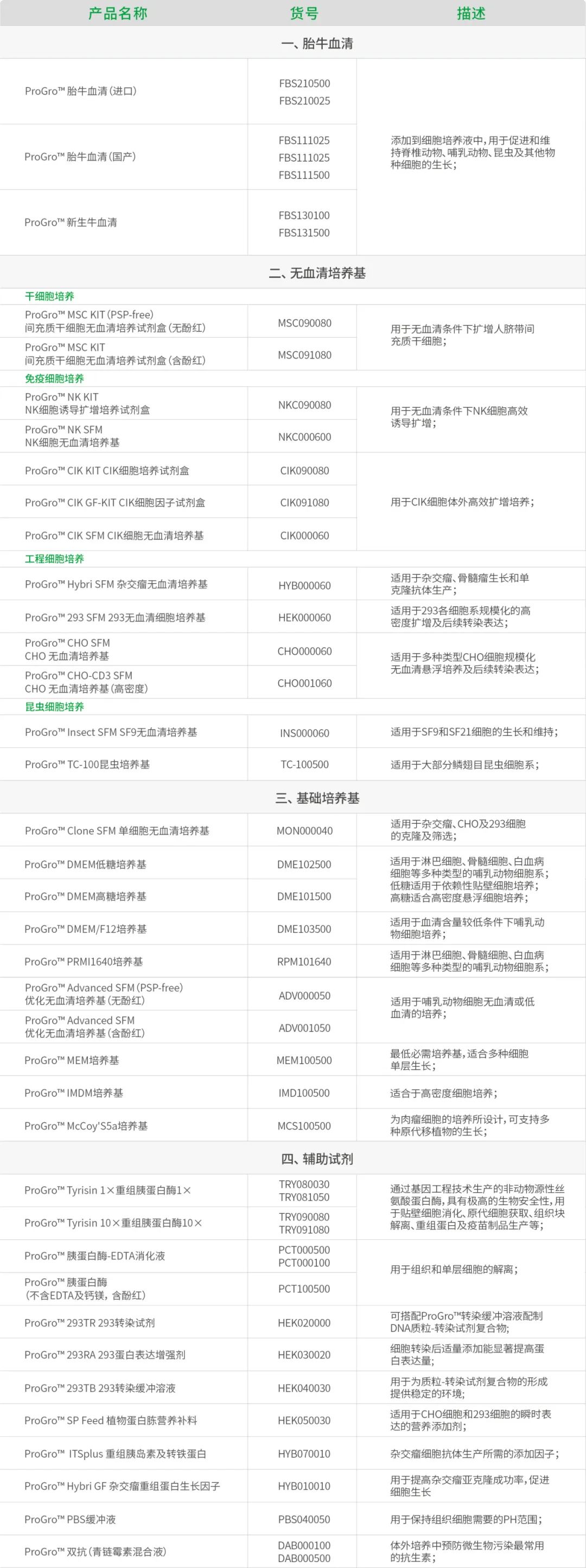 涵蓋了無血清培養(yǎng)基、基礎培養(yǎng)基、胎牛血清以及各類輔助試劑等四大系列。