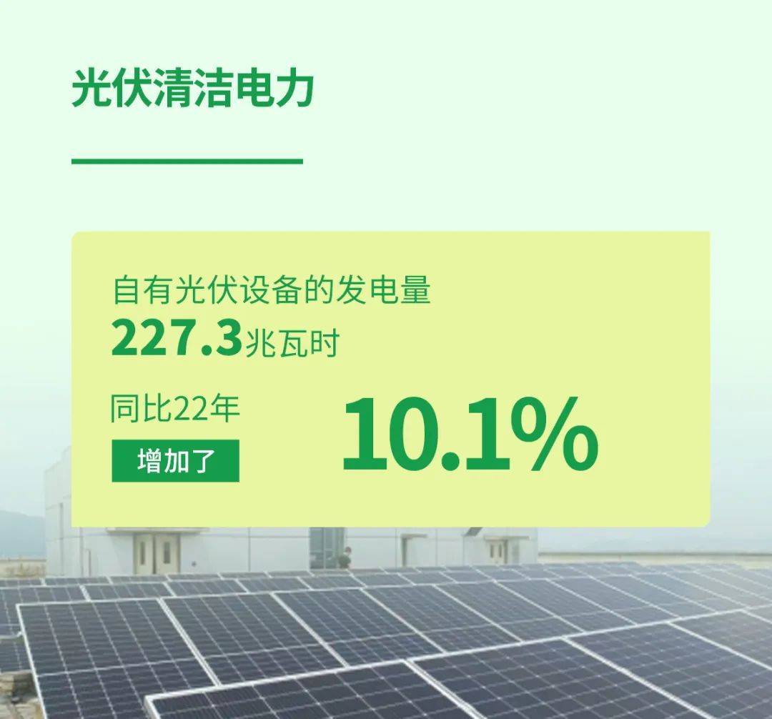 通過興建自有光伏發(fā)電設(shè)備機(jī)組,潔特生物在自身運(yùn)營中持續(xù)引入可再生清潔能源。企業(yè)自有光伏設(shè)備2023年全年總發(fā)電量達(dá)227.3兆瓦時(shí),相比2022年的206.5兆瓦時(shí),同比增長10.1%。光伏電力的使用使企業(yè)生產(chǎn)辦公減少了對(duì)傳統(tǒng)能源的依賴。