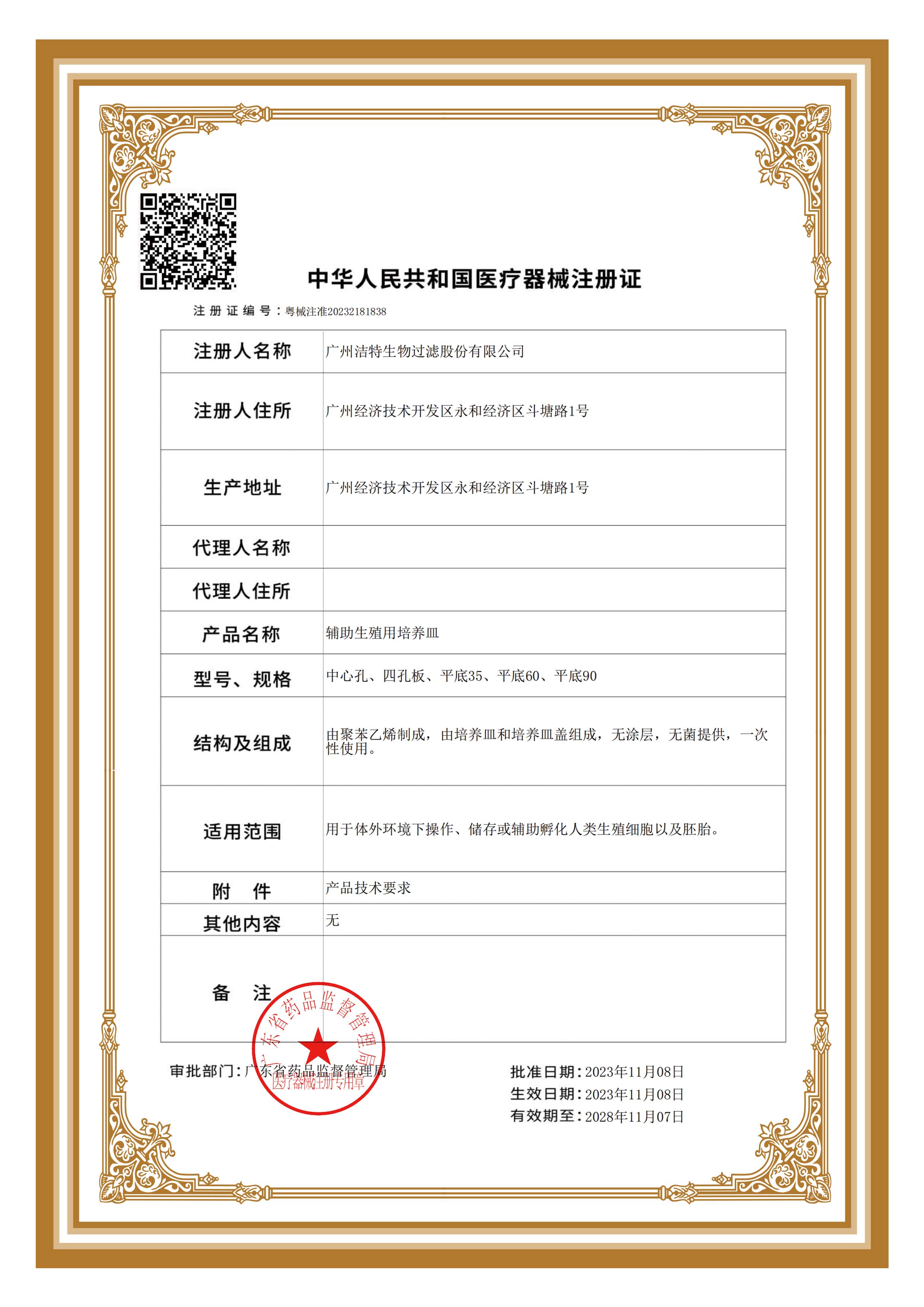 近年來,潔特生物潛心研發(fā),開拓了許多新的產(chǎn)品線,包括生物工藝系列耗材、輔助生殖系列耗材等,本次招商的是輔助生殖耗材,其中,輔助生殖專用培養(yǎng)皿已獲批醫(yī)療器械注冊(cè)證(注冊(cè)證編號(hào):粵械注準(zhǔn)20232181838)。
